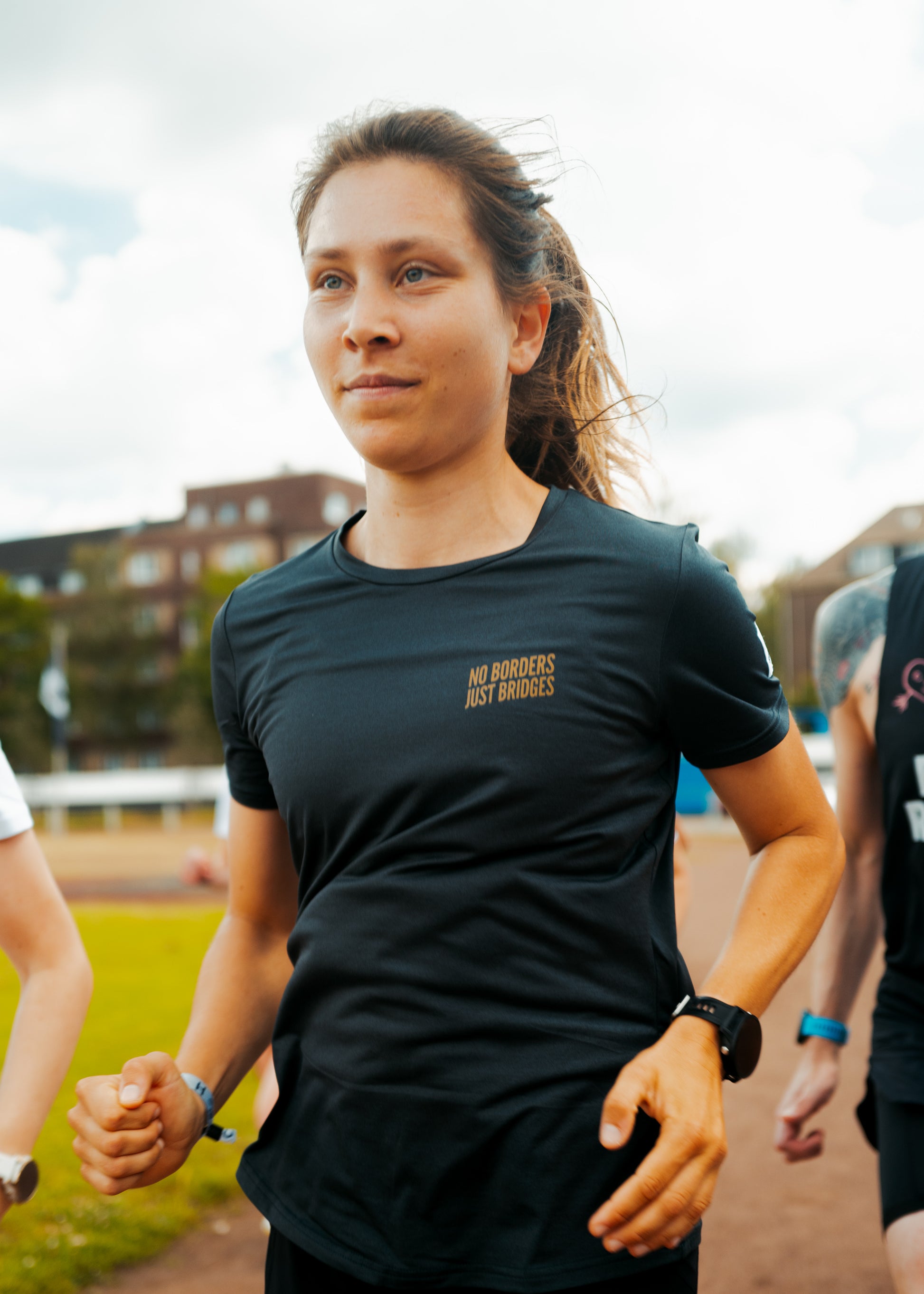 Das neue Damen Crewshirt der SAYSKY Pace Kollektion hat eine reguläre Passform und ist so konzipiert, dass es dir sowohl Komfort als auch ein hohes Maß an Leistung beim Laufen bietet. Es kommt in einem schlichten schwarzen Design und hat ein gewebtes SAYSKY Label auf dem linken Arm und auf dem Rücken. Der NO BORDERS JUST BRIDGES Schriftzug findet sich vorne wieder und das neue BR Logo wurde diesmal auf dem Rücken berücksichtigt.